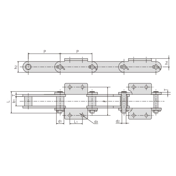- L-vormige verbindingsplaten – verticaal deel bevestigd aan het bovenste uiteinde van de binnenste kettingplaat met horizontale montagegaten – verbeteren de verdeling van de belasting en voorkomen vervorming of schade door ongelijkmatige kracht.