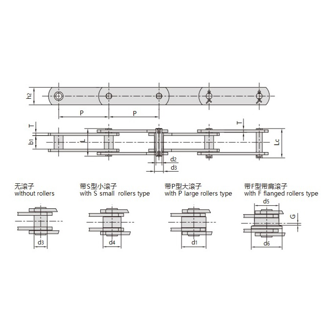 • S-type kleine rol:De diameter van de rol is kleiner dan de hoogte van de koppelingsplaat, waardoor de tanden van het kettingwiel en de kettingkokers worden beschermd; wordt vaak gebruikt in grijperhefsystemen.