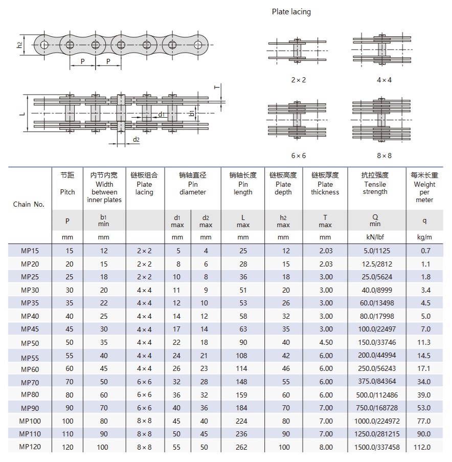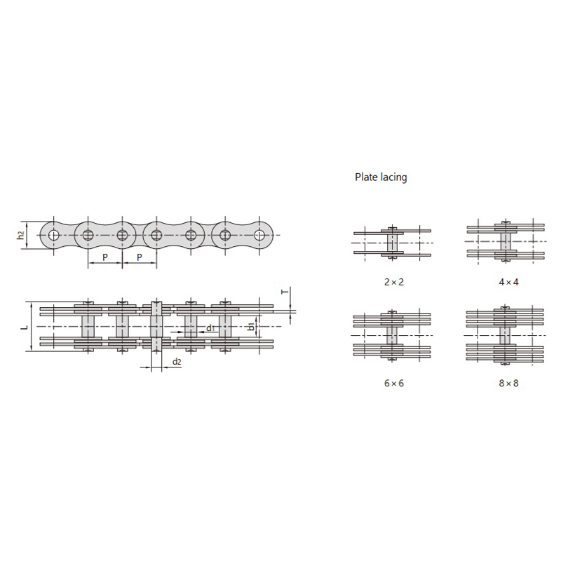 - Combinatie van twee dikke kettingplaten en drie dunne kettingplaten, voor een gelijkmatige en symmetrische kracht zonder extra buigmomenten.