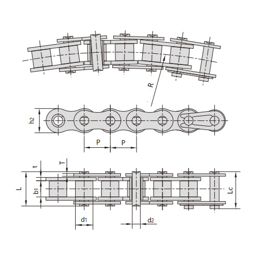 - Speciale buigstructuur:Ontworpen om de integriteit en flexibiliteit van de ketting te behouden bij het nemen van bochten met een straal R die kleiner is dan de overeenkomstige railradius van de apparatuur.